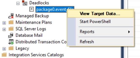 - Expand the Deadlocks session, right-click on the event file, and select View Target Data.