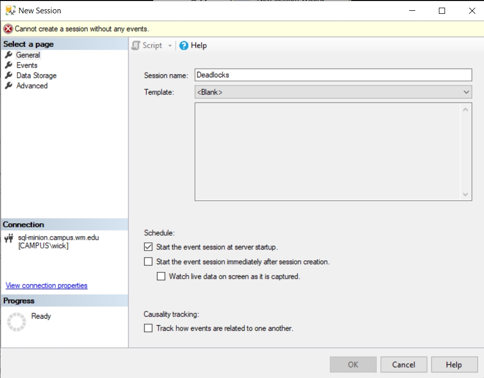 - On the General page, enter a descriptive Session name, and select the ‘Start the event session at server startup‘ and ‘Start the event session immediately after session creation‘ options.