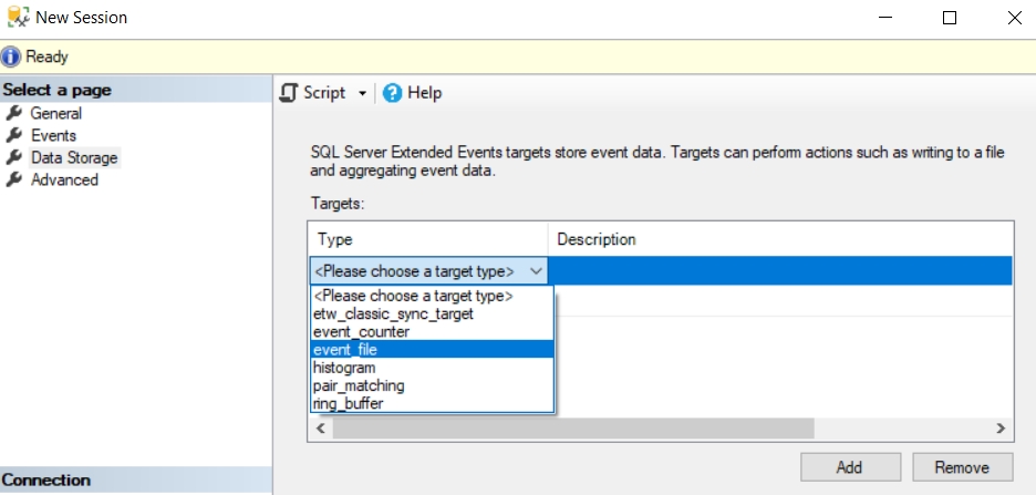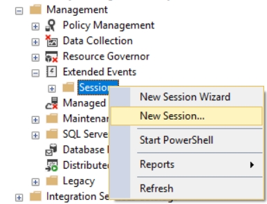 - In SQL Server Management Studio (SSMS), expand the Management and Extended Events folders, right-click on Sessions and select New Session.