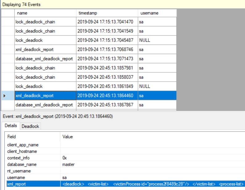 - Scroll to the bottom of the event list, select the most recent xml_deadlock_report or database_xml_deadlock_report, and double-click on the xml_report in the Details section. This will open the xml report in a new tab.